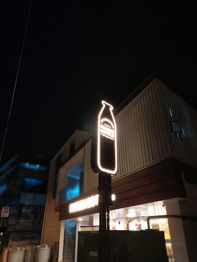 The novel idea of the juice bottle used for anything- from serving milkshakes to using it as a light bulb is just fantastic. The interior is moulded around the the of the bottle. Even their logo exemplifies the bottle in the centre.
