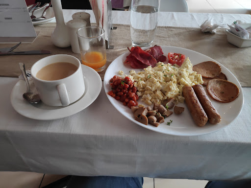 2 Slices of Bread Toast with Butter/ marmalade and Strawberry jam Fresh Juice Tea/Coffee Scrambled Eggs 4-5 strips of Bacon 3 slices of Chicken Ham Chunks of slightly fried Mushrooms 2 Chicken Sausages Baked Beans Grilled Tomato