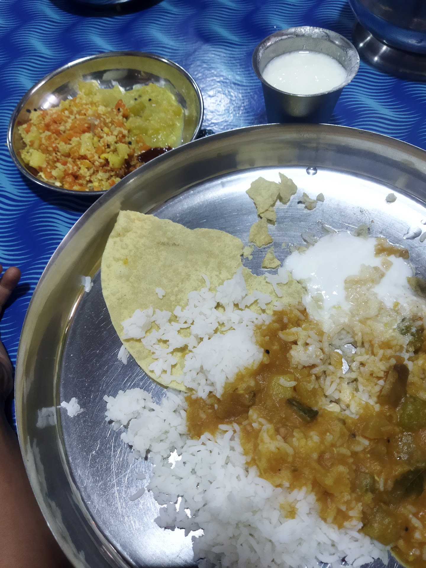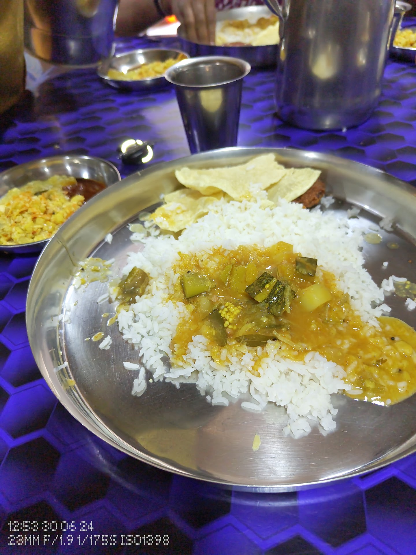 But everyone sucks it up for the food. They serve rice with two vegetable dishes, pappadam, buttermilk and hot parippuvada.