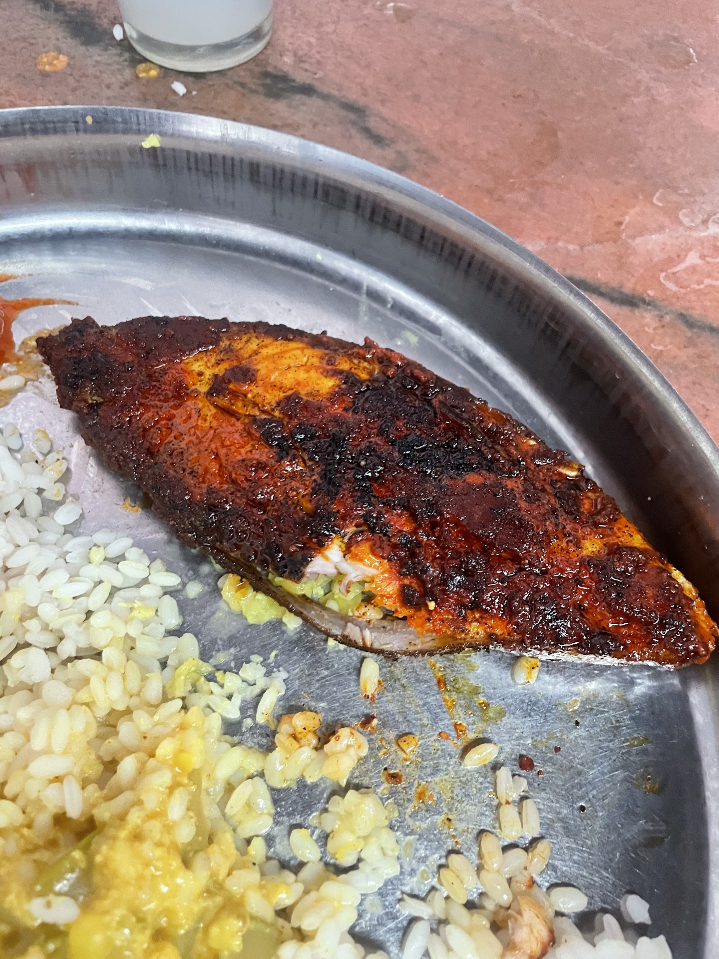 We ordered meals with red snapper fry (chemballi),king fish fry (ayakura), prawns curry,crab masala,fish roe (meen mutta),squid curry(koonthal)and mutton brain. Red snapper fry was the show stealer(damn good).Other dishes were fresh n tasty too.Felt like they used same gravy for parwns n squid.They also have goat head n fish head curry.