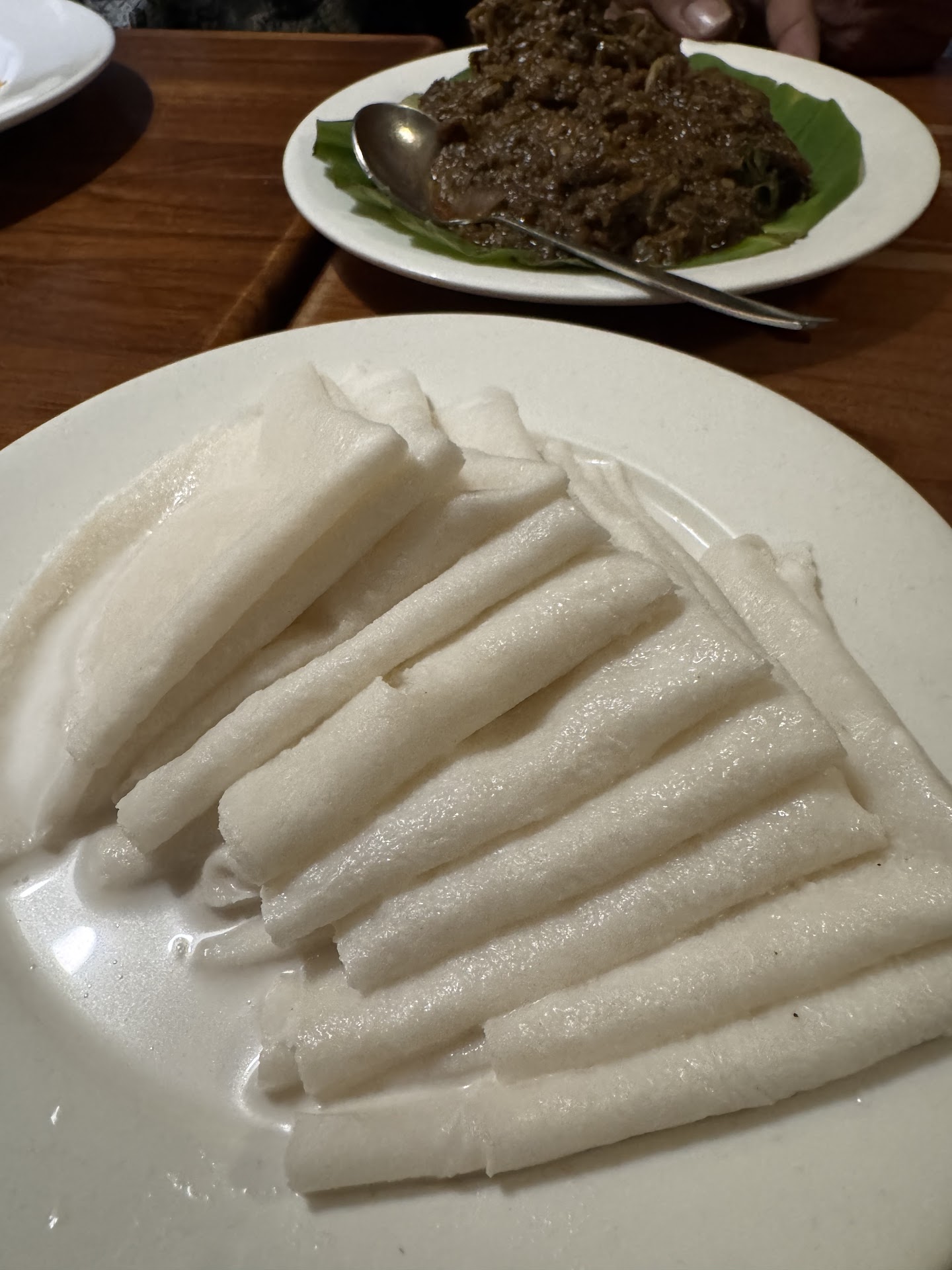 Here's a list of all that we ate : Kunjipathiri with beef (obviously) Chemmeen pori choru Irachi choru Kozhi pidi Chemmeen pollichathu Chemmeen dry fry Duck roast Chappathi etc.