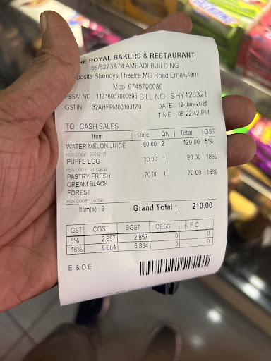 Read moreI recently visited Royal Bakery and was quite disappointed with my experience. I ordered a watermelon juice without sugar, expecting a refreshing, natural juice. However, what I received was more like water with a faint hint of watermelon flavor. The juice was diluted to the point where it felt like plain water with just a touch of flavoring.