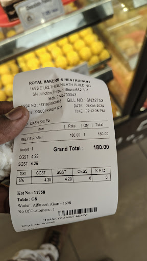 I recently visited Royal bakers and ordered the Beef Biriyani, which was priced at ₹180. Unfortunately, the dish failed to meet my expectations.