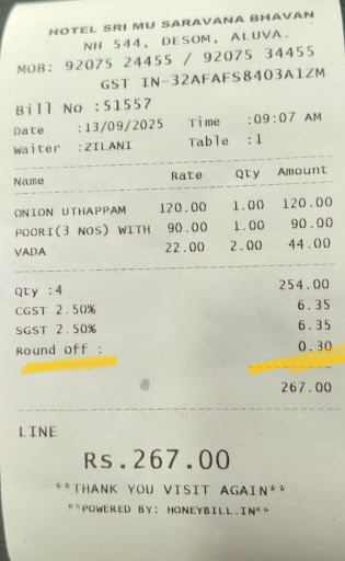 Read moreI’ve had the pleasure of dining at Sree Mu Saravana Bhavan across multiple Branch, and I’ve always been impressed with the food quality, portion sizes, and service. However, there’s an issue with the billing process that I think needs attention. On several occasions, I’ve noticed a round-off charge for any value under 0.99 paisa. When I inquired, the staff initially explained it was part of the GST. After further discussion, they clarified that the extra charge was simply to round off the total, since paisa isn’t used in cash transactions. While I understand that paisa isn’t typically used in cash payments, most customers now pay via UPI or cards, where paying the exact amount—including paisa—is possible. Despite this, the round-off system is still being applied. Many customers may not notice this, which could potentially lead to overcharging over time. Given Sree Mu Saravana Bhavan’s wide presence and large customer base, this practice feels somewhat misleading. I urge the Saravana Bhavan team to reconsider this round-off system and adjust the billing process accordingly. It would be greatly appreciated if the bills reflected the exact amount, especially for digital payments, to ensure transparency and fairness. I hope this feedback will be taken into account and lead to positive changes for the benefit of...