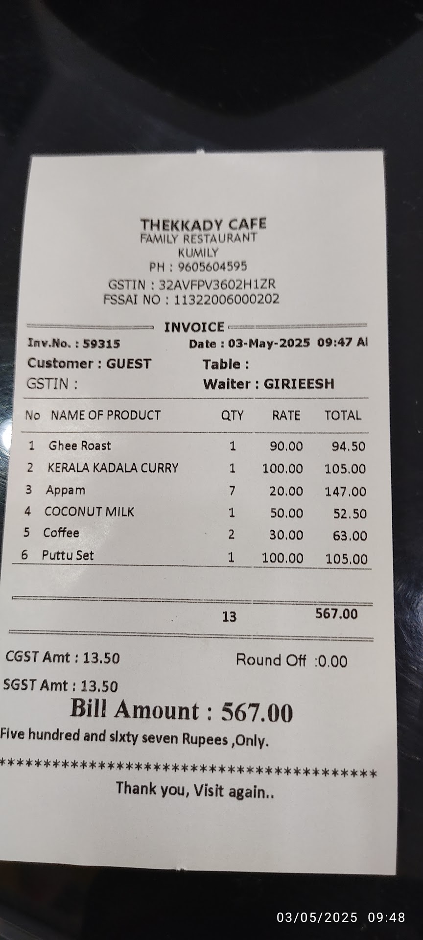 Read moreFor a middle class family this cafe is too expensive. Last 19.05.25 we family were visited there for lunch. The server recommended for Kerala special non veg meals, fish fry and mutton fry. We are five adults and two kids. We expected the bill amount will be around Rs. 2000/- but the final bill amount made really unsatisfied us. The bill amount was Rs.4030/-. One more horrible thing was the server served only 4 pieces of fish fry in table. But they billed for 6 pieces. This tooks Rs. 520/- more extra, all we came to know this mistakes after reach home only. Its was our blunder only. So, I checked the reviews of previous customers, few of them also faced the same problem of extra charges in foods. But those customers they found the mistakes instantly and those got the money back. But we are from Tamil Nadu, can't go back for solve this issue. My humble request before placing the order pls make sure the prices they charge and the final bill instantly. Still we are middle class can't afford this Rs.4030/- for a single lunch. I attached the bill copy here, if possible the management could refund the extra amount they charged from...