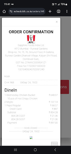 Ā Ā Ā Read moreThe staff behaviour was biased as I reached KFC late night at 1 am for satisfying my cravings but, the staff mentioned we only take swiggy or zomato orders, so ordered my request through zomato. But later one more group of customers walked in and directly requested for an order and the KFC Staff took their order directly without asking to place it through swiggy or zomato. So I complained about the same to KFC Staff and they just ignored me. So I would suggest not to visit this outlet also the food was cold and not fresh.....