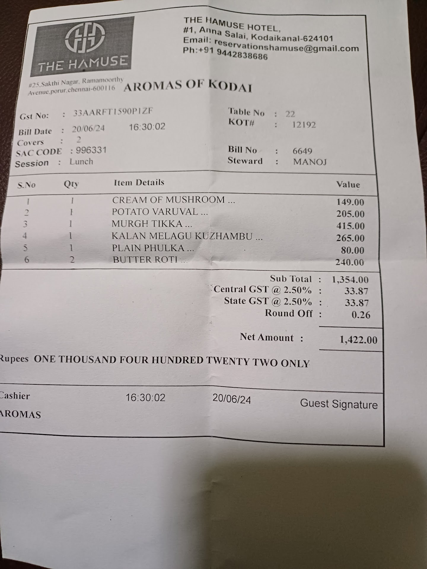 Read moreThis place is in the heart of Kodaikanal , next to Kodaikanal Bus Stand. We had been for sight seeing and had already checked out of our hotel in the morning & had to catch a bus to Bengaluru in the evening. We planned to visit Hamuse Hotel Restaurant called Aromas of Kodai. We were extremely hungry and were also looking for a place to just fresh up and use wash room , have some snacks and pack our dinner from here to carry during our journey back. This place served our purpose. However, let me mention the pros and cons: Pros: Excellent Location and Accessibility Food is always available in this place Really clean washrooms and a good place to fresh up They had vegetarian food available and also pack the food for takeaway.