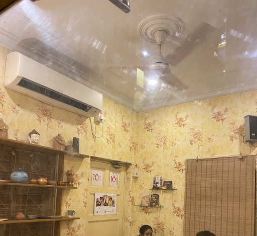 This was my first time in this cafe . place :- It is situated right beside Manyavar and mohey's showroom. food:- the food was average and the tea was very refreshing. i was sad when i saw the salad they served was in a plate which made it hard to have it (it would have been better if it was in a bowl instead of a plate.) price:- It is indeed reasonable in priceI took a pot of darjiling tea and a greek salad with chicken with 5% gst it total costed me to ₹ 283. service :- service is average and the behaviour of the manegment was good and they were helpful but only they took too much time in serving the food. i was actually disappointed on that because my dish was not such a huge dish to make and they at that point of time did not have much customer as it was afternoon. atmosphere:- thats a twisr for people who want to come here as its an artistic or aesthetic you may call kind of place and basically Rabindra Sangeet is plated all the time . All in all its a bit more than average but a bit less than 5 stars.