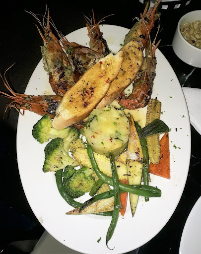 Relaxed lounge bar at a hotel presided by a giant Buddha statue serving traditional Asian dishes.
