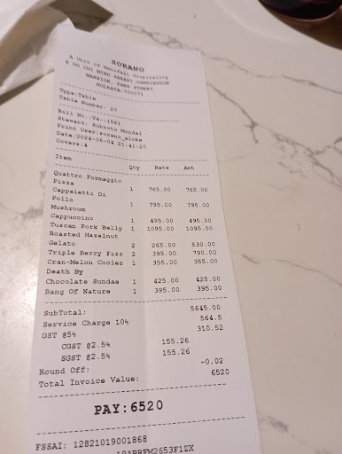 Dishes: MARGHERITA BUFALA: Perfect crust. It was as it should be. Nice, light and cheesy. BURATTA CAPRESE: Best burrata ever! It was so fresh and the greens had an amazing dressing. SALMON CROSTINI: The salmon mix went really well with the toasted bread beneath it. It had a melt in the mouth texture. A drizzle of the herb infused olive oil enhanced the taste even further. WILD MUSHROOM RISOTTO: The best dish of the day! Who said veg food is not good enough ? Well sorano is here to prove you wrong. Arborio rice cooked perfectly till al dente in rich cheesy delicious sauce made my day. 12HRS BRAISED BONELESS LAMB SHANK: Tender, melt in the mouth, flavourful boneless lamb pieces are to die for. The brown sauce was on point and went well with the mashed potatoes and crunchy sautéed veggies as well. But was a bit upset when i got the super thinned sauce on refill. The quantity of each dishes were enough for individuals.