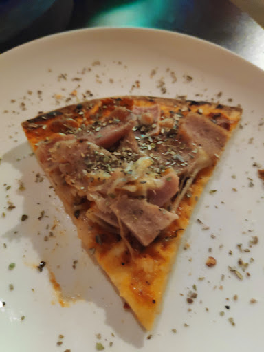The pizza had thin crust and seemed to be smaller than eight inches. The meat was not fresh, it was worse than the frozen meats we get from typical food delivery services, and absolutely bland and tasteless. I got some meat but it lacked the taste of either any chicken or pork. There was some cheese, but no other condiments.