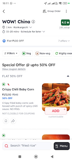 Read moreI took this order 30 minutes ago, but it was taken away. When I opened the box, I noticed that the rice quality was less than 60% of their usual standard, and the Manchurian didn’t taste good. I used to order from Wow! China on Swiggy from another outlet, but this time, I was very...