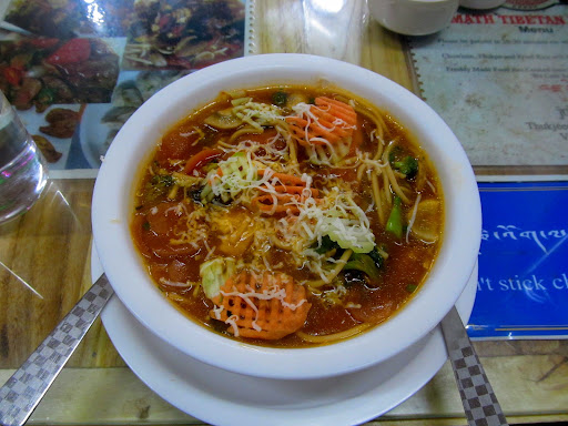 I walked in when there were just two other tourists, so I walked up to the counter and asked for the menu. There were two women cooking behind the counter. I was shown the small menu. I asked for a "thukpa" and lemon tea. One of the women at the counter said lemon tea wasn't available, so I opted for "butter tea." Another Tibetan specialty.
