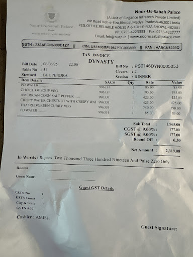 Read moreMing's Dynasty is a cosy Chinese restaurant in the Noor us Sabah Heritage palace hotel. Loved the vibes and ambience. Outdoor lake views are exotic even while seated inside. Perfect way to spend an evening with the Chinese fare. We went for the recommendations given by Shubham who served us with par excellence. For starters we had Honey chilli Lotus stem (little sweet), and Diced cottage cheese(simply wow). In main course we went for Cashew & Chilli fried rice(exotic) and Paneer Sapo (special dish not on menu). For mocktails, we had Lemon iced tea and Virgin mojito. I went with server recommendations to ensure that we enjoy food as per Indian palette. We really loved the views, so we are paying for that more than the food. Cost per pax is ₹1000 to ₹1200 (including tax) with starters, main course...