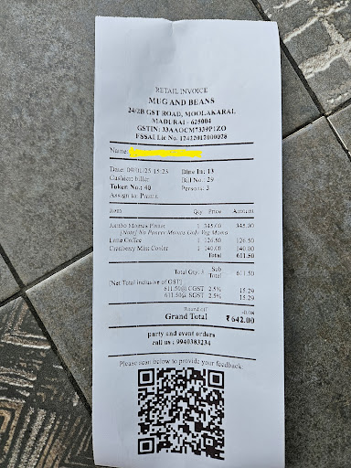 Read moreFrom my opinion I don't feel satisfied. Here's my explanation why, Only 3 or 4 cars can be parked so if you are the 5th person then you will struggle lot to park your car also very close to the bypass road which you will see vehicles rushing you need to be keep an eye on your vehicle. The ambience looks good but if its raining you will enjoy showering, it was around 7.30 PM when I reached mug and bean, it started to rain and i was seated in the upstairs with my wife, all the seats where filled with water and its pouring on us. The construction was not that good. No electrical backup facility - My entire dinner went on a night mare. They not even have a emergency lamp, so visitors please have battery backup in your mobile you need to have your own lights if there is no power. Food - I ordered Chilli Panneer, Creamy pasta and panneer noodles. Chilli panneer was tasted like the panneer was not fried properly and the masala smell still on it felt like not cooked properly, Pasta was ok, panneer noodles was extremely oily you feel like tasting oil. More over the food was not good and healthy from my point. I think since there is no power chef was in confusion about cooking 😂😂 If someone feel like the same comment me.
