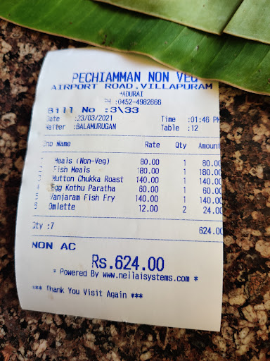 Mostly, I am maximum away from family and spent my carrier at Chennai. I tasted variety of hotels in Chennai. If taste is good but prices are very high in Chennai & the same case in Madurai also. ( Direct Proportional ). But in this Villapuram Pechiammam Non Veg Restaurant taste is very good and price is very very less while comparing with other high class restaurants.