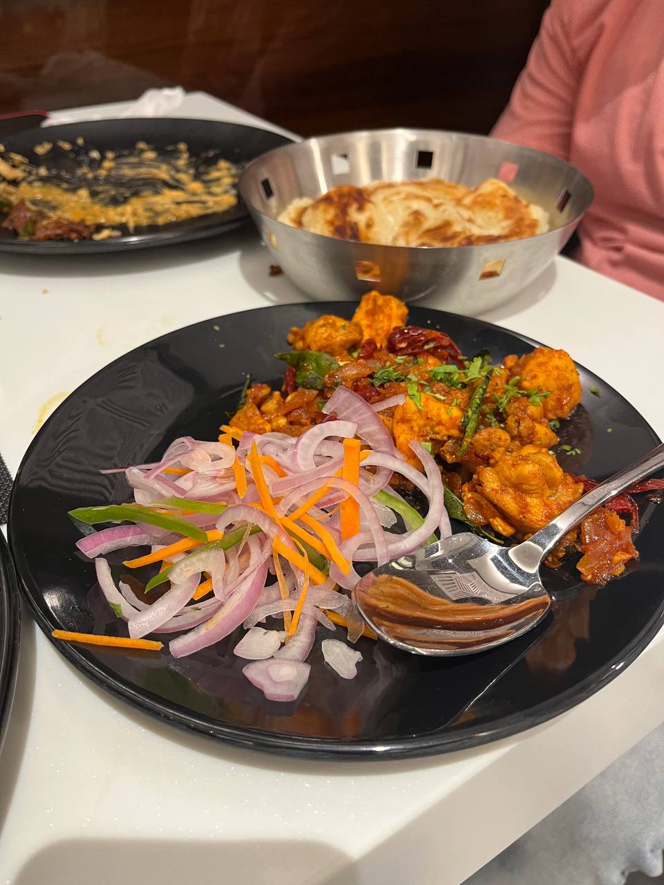 Our food experience was disappointing. We ordered two portions of butter roti, but it was hard, cold, and overcooked. The Chicken Chettinaad gravy was overpriced and undersized, with an excessive amount of salt. The Chicken Schezwan noodles were cold, bland, and served in extremely small portions – only about five spoonfuls.