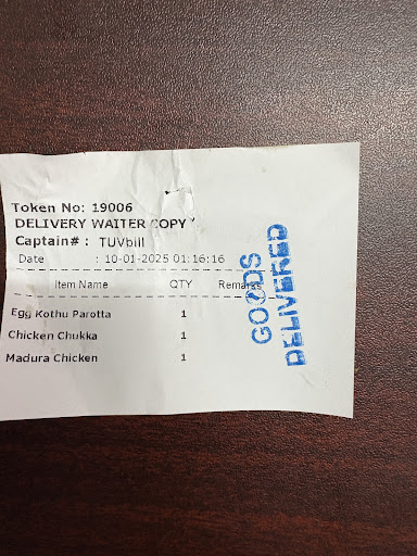 Read moreI have ordered egg parotta , chicken chukka and madura chicken through swiggy. Parotta and chukka was ok but madura Chicken was completely over cooked. They packed and sent. When I received the parcel I could notice the burnt smell before opening. I am not sure whether the person who cooked doesnât have the ability to see,smell or inexperienced. Completely not acceptable from this kind of...
