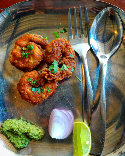 PRAWNS FRY Battered prawns deep fried. Even after being deep fried these were not at all oily. Medium spicy flavours went well with the pudina chutney provided.