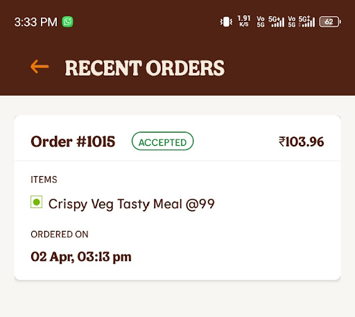 Read moreI ordered paneer tikka shawarma but instead I received chicken shawarma. how can such a mistake be made,this is totally unacceptable. I'm a pure vegetarian and ate it I'm very upset and very frustrated at the same time I called the customer care and he's offering to give us a mere pizza puff as compensation and on showing him how enraged we are he offered us 2 pizza puffs like is this a joke this shows that they don't have any sense of professionalism We only asked him to deliver my original order and let us speak to his senior He told us we'll get a call back in an hour but didn't receive one So we called them ourselves and the obvious happened THEY DIDNT PICK UP We called them repeatedly 4 or 5 times in hour intervals and yet no one recieved our call