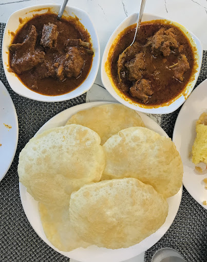 Then came the Luchi and Mutton er jhol. UffffâŚ.. simply made the Sunday lunch⌠light, flavourful and The size of the luchi was perfect. The mutton Kosha that followed after this was dark in colour with the perfect blend of spices.
