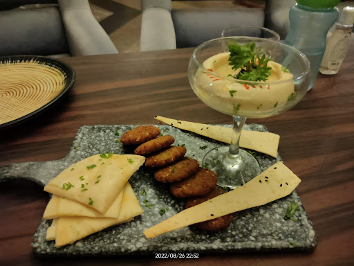 Hummus with falafel: Delicious Hummus with olives and served with falafel and papad. The presentation was quite good and could be served little hot.