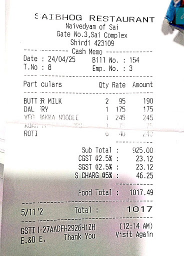 Read moreDear All, I would like to share my experience in “Saibhog Naivadyam Restaurant” in Shirdi. The Restaurant is located just beside the Temple near Gate No.3 & location wise you will find them the closest, when you come out from the temple. The menu rates found to be unrealistic, unreasonable & exorbitantly high. After having our breakfast, when I asked for the justification for the rates, it was clarified, the monthly rent is very high, which is being compensated thru the menu rates. Is it justified to loot the customers (devotees) this way, when they are located in such a prominent & Holi place ? Few of the menu rates are: Orange Juice – Rs. 165 (Though the Orange Rate is Rs. 100 for 2 KGs) Puri Bhaji – Rs. 195 Onion Uthapa – Rs. 175 Misal Pav – Rs. 145 Would like to request the devotees to avoid visiting them & strongly recommend the Restaurant Management to revisit the rates and make them justified, off course taking into consideration of the establishment & overhead costs at that...