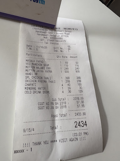 рдореА Surves рдЪрд╛ рдирд┐рдпрдорд┐рдд рдЧреНрд░рд╛рд╣рдХ рдЖрд╣реЗ, рдкрдг рдпрд╛ рдЕрдиреБрднрд╡рд╛рдиреЗ рдорд▓рд╛ рдирд┐рд░рд╛рд╢ рдХреЗрд▓реЗ! рд╣реЙрдЯреЗрд▓/рд░реЗрд╕реНрдЯреЙрд░рдВрдЯрдордзреНрдпреЗ рдЪрд╛рдВрдЧрд▓реЗ рд╡рд╛рддрд╛рд╡рд░рдг рдЖрдгрд┐ рдЬреЗрд╡рдг рдЕрд╕рд▓реЗ рддрд░реАрд╣реА рдЖрджрд░рд╛рддрд┐рдереНрдп рд╣реА рдорд╣рддреНрддреНрд╡рд╛рдЪреА рднреВрдорд┐рдХрд╛ рдмрдЬрд╛рд╡рддреЗ, рдкрд░рдВрддреБ рд╕рд░реНрд╡рд╛рдд рдорд╣рддреНрддреНрд╡рд╛рдЪреЗ рдореНрд╣рдгрдЬреЗ рдЧреНрд░рд╛рд╣рдХрд╛рдЪреА рд╡рд╛рдЧрдгреВрдХ, рдЬреА рдорд╣рддреНрддреНрд╡рд╛рдЪреА рдЖрд╣реЗ рдЖрдгрд┐ рдЕрд░реНрдерд╛рддрдЪ рдЕрд╢рд╛ рдкреНрд░рдХрд╛рд░реЗ рдиреНрдпрд╛рдп рдХрд┐рдВрд╡рд╛ рд╡рд╛рдЧрдгреВрдХ рдорд┐рд│реВ рдирдпреЗ рдореНрд╣рдгреВрди рдЖрдореНрд╣реА рдЕрдиреНрдирд╛рд╕рд╛рдареА рдкреИрд╕реЗ рджреЗрддреЛ!!