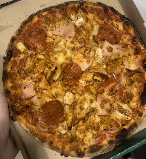 Presentation:Â Served in a classic cardboard box, the pizza is presented with care. The small white tables placed on the pizza ensure that the ample toppings remain undisturbed, preserving the visual and gustatory appeal.