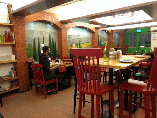 The ambience is very lively and the place is brightly lit up. The walls have been lined with some informative frames about the history of Pizza, the background of ingredients. The walls are lined with arcs made from amber red bricks. The seating is of two types; table of normal height & high seating tables. Soft jazz music is played in the background which does not interfere in the conversations.