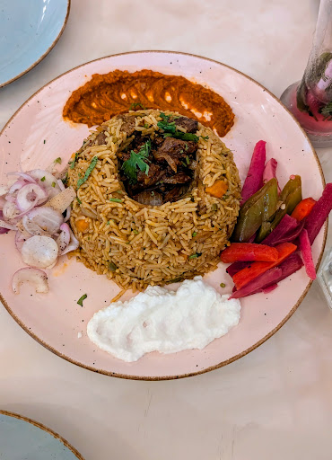 A centerpiece of Arabic comfort food. The rice is fragrant, mildly spiced, and studded with vegetables, while the lamb pieces on top are slow-cooked and juicy with a smoky-charred depth. What elevates the plate are the accompaniments: Pickled vegetables , Creamy yogurt