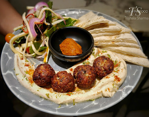 The Mediterranean platter is an exotic platter with a perfect Mediterranean touch to it All sorts of delicious eats, piled high onto a platter, so people can nibble as needed. The platter consisted of Hummus along with veggies salad, Harris. At the corner, there was freshly baked pita bread topped with chicken meatballs. The chicken meatballs were crunchy and well prepared