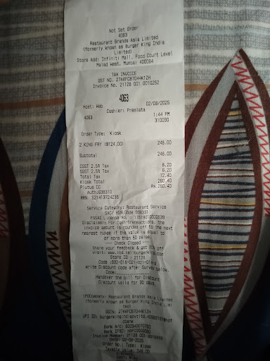 Read moreI didnt wanted to give one star also but what to say there's no option such a big brand and outlet at malad inifiniti mall burger was yuck staff was useless illiterated no sense of talking or answering its the taste was disgusting it was not fresh at all ordered two burgers with peri fries ans a coke..with that she gave me one sachet of sauce and two tissues dtz all ...we can afford so its ok but i fired thwm alot what about people who come rarely to eat pver thwre like middle class college students and people who comw hardly to eat over there its just a shame ur providing a disgusting food this is my genuine review seriously go to borivali's outlet i swear u will love their taste they make so fresh burgers with such a smiling face ......burger king should do something about this ..should take an action if something like this happens m not talking talking about every burger king outlet yes there might be few but one of them is this outlet at malad infiniti other wise never had such a worst burger from a burger king always loved it #bugerking #infiniti #malad @burgerking...