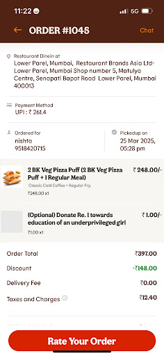 I would like to pay your attention that yesterday i placed an dine in with order #1045 (2 BK Veg Pizza Puff (2 BK Veg Pizza Puff + 1 Regular Meal) -Classic Cold Coffee + Regular Fry.