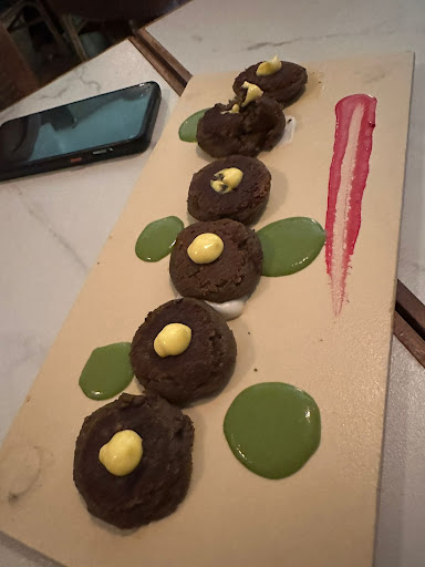 Mushroom Galouti with Labneh : So it's basically a mushroom tikka, made of smashed 🍄 mushroom. So it's but difficult to eat reason is that it is so soft that you can't pick it from your hand, it will shatter. You have to only pick it from the 🍴 fork or spoon. The sauce will be in the slides. The taste was good 3.5/5