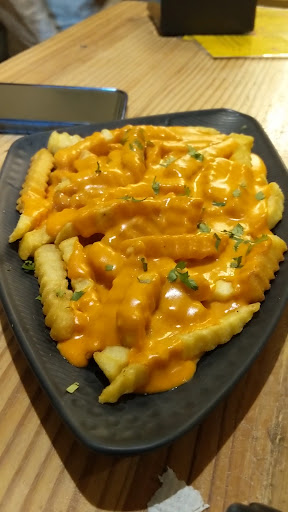 This place has lots of college guys coming to hangout. This place is not big and doesn't have lots of seating arrangement. It can accomodate at Max 10 people. You need to go to first floor to eat food. The ground floor is for the kitchen and the reception kind of place. They have a washroom too accomodated in such a small place and the ambience is also good. They have proper chairs and also bed kind of arrangement to spread your legs and eat. This was something unique that I found at this place. Also they have games to play such as Chess etc. We tried peri peri cheesy fries and that was a bit spicy. People who like spicy can eat it all. I couldn't finish the cheese and felt bad about it as it was tasty but a bit spicy for my taste buds. We tried classic vadapav and Chipotle vadapav(which had a unique sauce). That was the only difference. It was fine. Not too amazing. And then the pizza pockets was something very unique that I had never tried before. Also the fries shape was not like the usual...