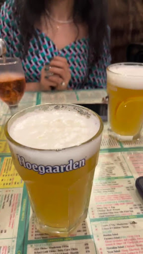 Thirsty beyond belief, we immediately ordered two glasses of ice-cold Hoegaarden beer and a small bottle of Sula Rosé wine. The beer arrived with a slice of orange, enhancing its citrusy notes, and we downed it like it was water on a scorching day—crisp, refreshing, and exactly what we needed.