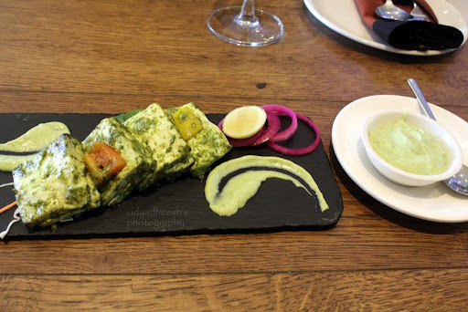 BASIL PANEER TIKKA [INR 330] Paneer Cubes were marinated using a basil & herb paste and lightly grilled. The Paneer was melt-in-the-mouth soft & fresh. The chunks were decently sized. The marinade had a good flavoring of basil which was not very overpowering to the other spices. It was served with pesto mayonnaise, which was amazing & gave a fillip to the overall taste. RECOMMENDED