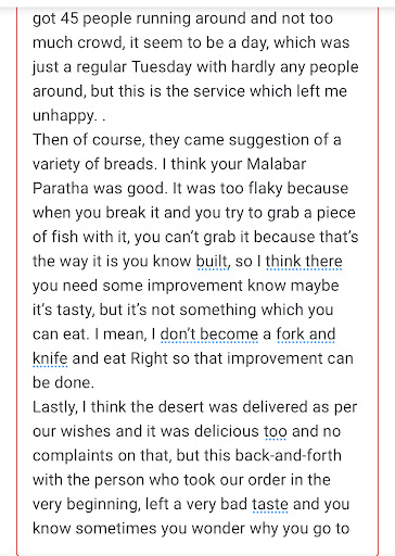 Now I am very mindful of the fact that somewhere or the other we all are a mix of consumers and service providers stuff like that and I have full respect for the owners and at no point I intend to bring them down and make them feel anything else, but take it as a positive feedback to Change what is wrong with your establishment. Otherwise food is pretty good. Maybe the portion size could have been better, but let me begin from the beginning.. We were greater nicely and seated, but very strangely the table for six was arranged in a way that one table was at higher level. In the other table. Iâve come for a fine experience okay and this is not what I would have liked. Your chairs are so uncomfortable As the back Rest is minimal, so I think I ended up feeling very very uncomfortable during the entire meal, which was supposed to be a birthday meal with a friend. Going on to the next part, which is placing the order. Now when we were talking about drinks, our guest did not want the regular. Whatever drinks you had to offer, but we did want to have the Coke Sharbat and I think itâs called Sol kari, so Iâm dictating this, so there will be some minor slips while Iâm dictating this message, so do forgive me for that. So this guy who is taking our order. He kind of assumed at one point that we told him to get four of the glasses and before leaving, he said something like final Hai Na, and it was in such a manner that it was really rude to which my husband was like. What did you just say, and even I ended up, calling him back and saying what did you say, and he said I was just confirming if this is your you know order Now when we invite people over they will there is bound to be some conversation where there will be flip-flops and we are thinking what you want to order and whether should be cold or room temperature. So the waiter the person who is taking the order has to have immense patience while taking the order this guy had zero patients appeared. Iâm sorry to say it was almost like drunk and some high horse, who as if you know you are doing me a favour by taking my order. Anyways he left and the order that we received was very delicious. I think freshly prepared to as said by the person in charge that is all freshly made, but we are asked for room temperature and a room temperature and a mix of gold that was not taken care of. We got cold All four glasses cold. . Our order, which was I think went smoothly, whatever orders we placed, but to tell you what happened they serve the upper before bringing the main dishes and the upper are turned cold. By the time they started serving us the main dishes, the main dishes there was lot more gravy than the meat. I donât know. Maybe this is your way of controlling portion, but you know if six of us are eating the dishes. Just look like measly platter is anyways, the taste was outstanding, so I will not complain about that. The service was actually I think not really that good except for that short gentleman who was trying to do his best, and then there was spectacle gentleman who had probably the duty of greeting the guess he was also alright, but I asked for water at least three times that did not come to my table. I was actually you know thirsty Rather as say thirsty for water. That was something strange because you got 45 people running around and not too much crowd, it seem to be a day, which was just a regular Tuesday with hardly any people around, but this is the service which left me unhappy. . Then of course, they came suggestion of a variety of breads. I think your Malabar Paratha was good. It was too flaky because when you break it and you try to grab a piece of fish with it, you canât grab it because thatâs the way it is you know built, so I think there you need some improvement know maybe itâs tasty, but itâs not something which you can eat. I mean, I donât become a fork and knife and eat Right so that improvement can be done.