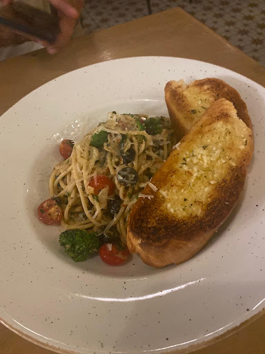 Spagetti aglio olio - perfectly cooked spagetti with a generous drizzle of olive oil, full of baby tomatoes, brocilli and olives. Crisp garlic bread on the side.