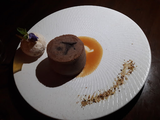 Sweet Course: Belgina chocolate Fondant: Belgina chocolate fondant served with White house churned peanut butter ice cream, chilly caramel crackle, toffee sauce & himalyan salt, good delight for chocolate lovers.