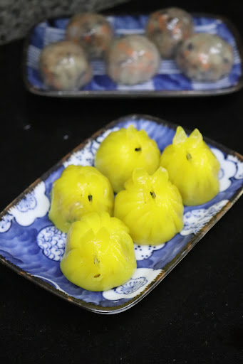 Chicken and Truffle Oil Dumplings A glutinous wrapper that resembles that of a hargao, stuffed generously with minced chicken, veggies and the aroma of truffle oil. Wrapped beautifully and shaped to resemble a little animal with 2 ears and sesame seeds for eyes. This ones a treat for the eyes and the palate.