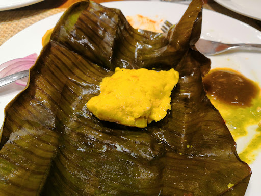 Gondhoraj Bhapa Murgi Kebab - an amazing creation of aromatic lemon juice, minched chicken steamed dumplings, wrapped in banana leaves