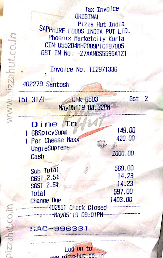Read morePizza Hut has dropped several notches below standard in all aspects. No one to welcome the customer. No one to show you to the table. Took forever to get the menu cards. Once decided what to eat.... We waited 15 mins just to get hold of the waiter and forced him to take the order.... As expected.... We could have watched the Eternals movie waiting for the food to be brought to the table. One positive in the total experience was pizzas were hot...!!! However were lacking in the taste and presentation department. It feels like the restaurant was not only short staffed in the service department but also in the kitchen department.... Its a known fact we Indians love our portion sizes and the value for money.... In continuations.... The guy preparing out pizzas probably was having a bad day or was instructed to cut costs or both.... The pizza looked malnourished and deprived of everything the pizza base was tough, the pizza sauce was just a spoon full on a medium pizza, the toppings were just to differentiate from each other... The cheese that makes the pizza a pizza was just delicious to satisfy the brain that something is better than nothing!!!. Over all we had ordered 2 medium pizzas 1 small Margherita pizza for the kid (which surprisingly came last) All the pizzas were so unappealing and of course unappetizing we did not click a single picture and definitely did not call for desserts. Please save your time and money and avoid any of the pizza Hut...