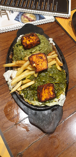 Green rice,sauteed green veggies,caramalised onions,paneer and french fries used in this sizzler