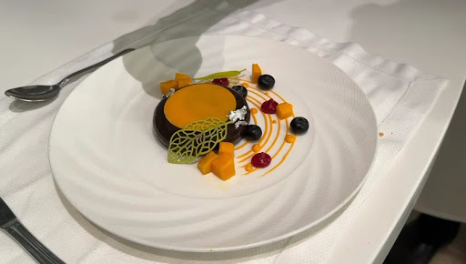 In the desserts, we were treated to a De-constructed Tiramisu, a famous Italian dish. Having a different presentation and girded by lady fingers and creme and chocolate cuts on top, it had a rich coffee texture and was brownish and spongier than the ones I have had in same-level restaurants. The size was small. The Classical-flavoured Cannoli with three flavours was a roll filled with flavoured, reasonably sweet creme, albeit one of the flavours was insipid, and possibly a change of flavours would find more takers. The chef agreed to my request to replace the original ice cream, and the chocolate ice cream [ sans almonds ] was delicious and made up for the cannolis. The size was large overall. Another off-the-menu dessert, whose name I have forgotten, which was offered to us, too, was a chocolate-based dessert whose layer was artistically molten by liquid chocolate to form a crater. It was delightful too.
