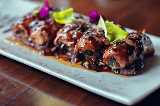 Tangy Chicken Curls with Red Wine, Pepper and Balsamic ( Rs.420 ) Butterflied pieces of chicken curled into stuffed cigars & tossed in a Red Wine, Pepper & Balsamic Vinegar sauce. This semi-dry appetizer had beautiful sweet-sour & berry notes owing to the wines & the vinegar. Each Curl was stuffed with a mix of chopped mushrooms, onion, leafy greens & cheese, cooked to perfection. The appetizer was garnished with Fringed Dianthus & Snapdragon.