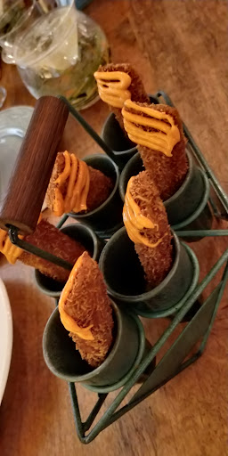 Nice crispy cheese and veggies stuffed sticks coated with sort of breadcrumbs served with a nice tangy sweet chilly sauce at the bottom.