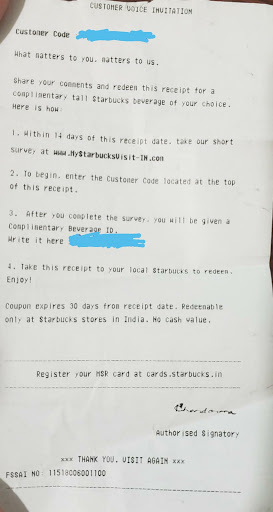 Among all the Starbucks I have visited worldwide this branch was not as good. Firstly there is no washroom in this starbucks and we have to walk about 3-5 minutes outside the starbucks to find the nearest washroom. Secondly I was given a 'customer voice invitation' from another starbucks and they said that I just need to fill the feedback online, scribble the 'Beverage ID' they give online after the feedback form and once I bring the receipt to any starbucks in India within 2 weeks of purchase I get a free Tall drink. As the receipt was very long, I cut out and brought the main portion which had my customer id and a pass code for the free drink at this Starbucks. They said they need the entire long receipt to validate the date, which makes no sense as the important portion of the receipt I brought had the customer ID and beverage ID which they could have looked up in their system easily and verified the date of purchase etc. So this free drink coupon/receipt scheme was not well organized and lures people to give feedback with false promise of getting free tall drink for giving feedback. Starbucks India needs to improve this program of feedback which is going on as we customers cannot carry long receipts and when we cut and bring the important part of the receipt with the details which they can pull out in their system at least this branch is not accepting it as per my first experience with the free drink coupon. I have attached the receipt in the review and it was within 2 weeks of the last...