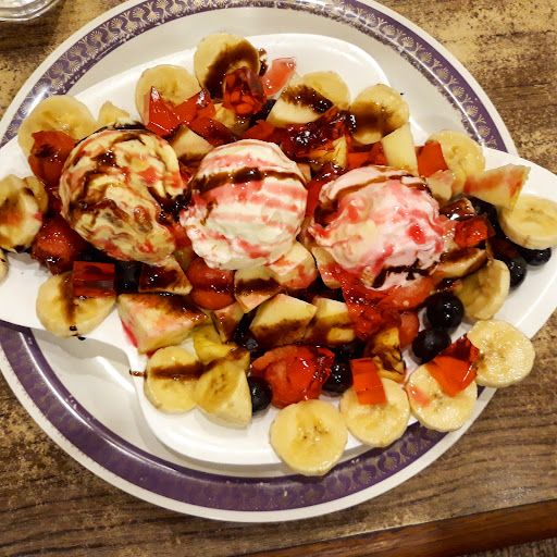 Desserts - Triple Sundae - Delicious. A combination of 3 flavours of icecream and fruits.. Royal Falooda - Okish Caramel Custard - Good